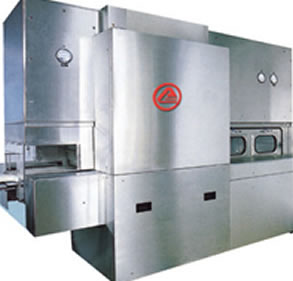 整機與(yǔ)瓶(píng)接觸部(bù)分均用不鏽鋼製造(zào)。隧道中輸瓶網帶采用日本三菱(líng)變頻調速。整機(jī)PLC控(kòng)製,觸摸屏(píng)全過程動態監視,熱風循環溫度自動控製並記錄,操作方便。