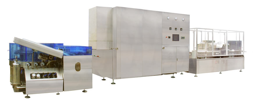 本機組符合(hé)“cGMP”要求,適用於(yú)安瓿的洗瓶(píng)、烘幹滅菌及灌(guàn)裝封口,由QCL型立式超聲波清洗機、MSH-B型熱風循環滅菌(jun1)烘箱、AGF型自動安瓿灌封機(jī)組成聯動生產線。
