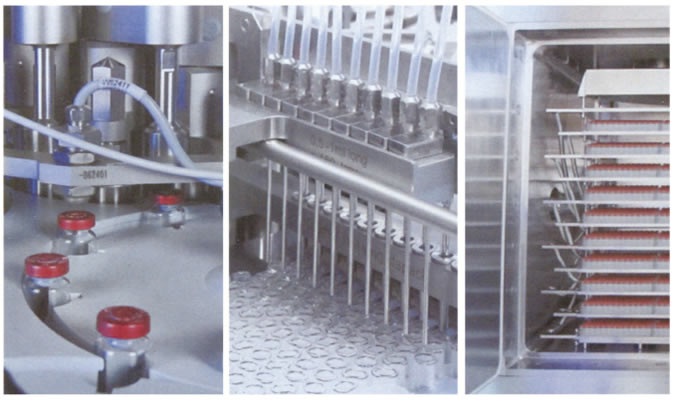 本機組符合“cGMP”要(yào)求,適用於西林瓶的清洗、烘幹滅(miè)菌、無菌灌裝及加塞,由CLQ-C型鏈式超聲波清洗機、KSM型玻璃瓶隧道式滅菌幹燥機、GGZ型高速液體灌(guàn)裝(zhuāng)壓塞機組成。