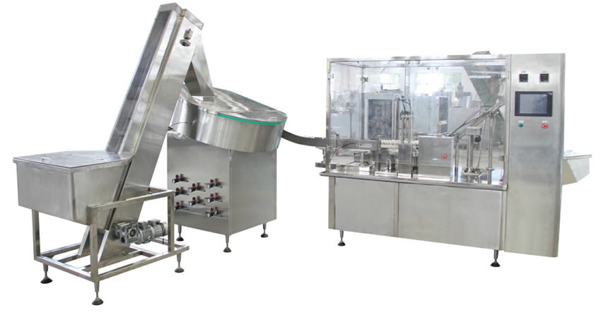 本機組符合“cGMP”要求,適用於新(xīn)型易折塑料瓶的灌裝(zhuāng)與熱封口,是參照國外同類機型(xíng)更新設計而成。 本機通過自動上瓶、底部灌裝、自動上蓋、熱熔式底部封口、機械手送出瓶等一(yī)係列特製工序後完(wán)成灌封 工作,是國內口服液灌(guàn)裝生產的理想設備。